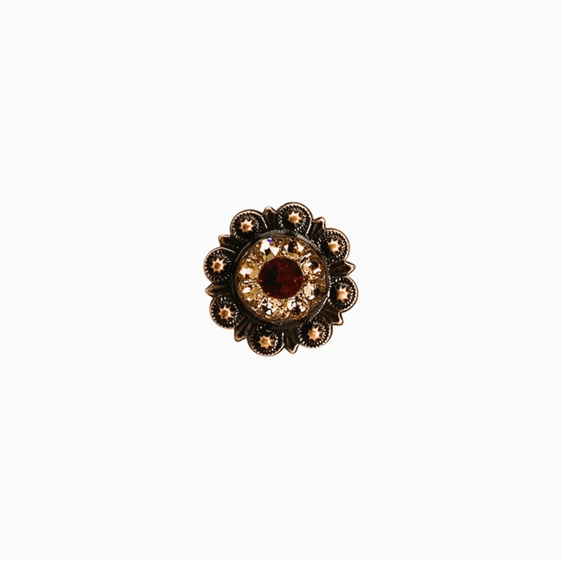 Copper berry style concho decorated with Ruby/Champagne European crystals. This concho measures 1″.