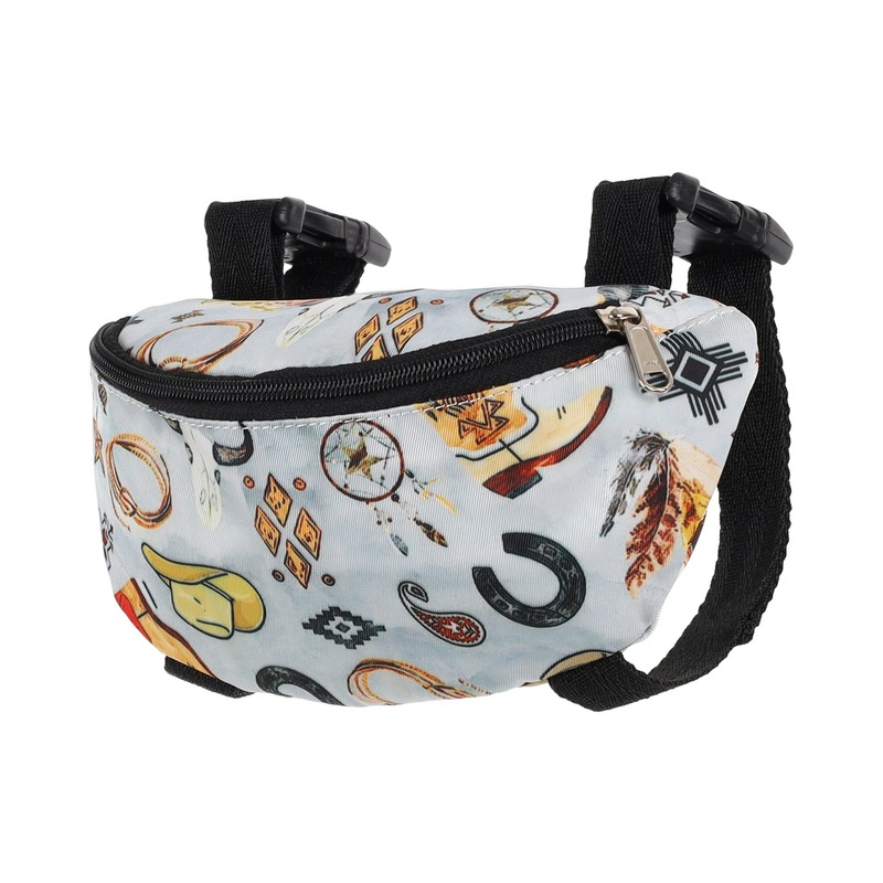 SF178938Saddle up and show off your Western flair with the Showman Wild West Saddle Pouch!This light gray nylon pouch is decked out with a playful Wild West print featuring cowboy hats, boots, lariats, and horseshoeseverything a modern cowpoke needs to rid