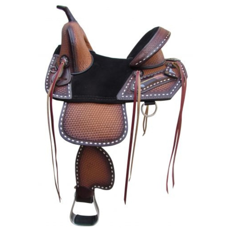 Double TTreeless Saddle with Hand-Painted arrow design. The saddle is fully basketweave tooled with a black suede seat and natural buck stitch trim. The saddle comes with a hoof pick holder on the skirt that is accented with a hand-painted arrow design. Accented with brushed nickel engraved conchos, aluminum stirrups, and leather strings, and comes complete with the nylon off-billet and tie strap.