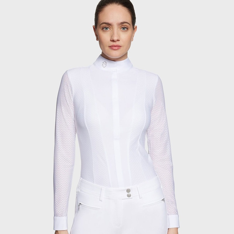 Combine style with functionality in the Samshield Marina Long Sleeve Show Shirt, which has beautiful white semi-sheer texturised fabric.The technical fabric contains temperature-regulating technology, which acts to wick moisture away from the skin to keep