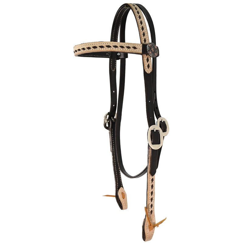 San Saba Equine Roughout Browband Headstall with Chocolate BuckstitchNatural roughoutChocolate Buckstitch with Chocolate underlayFloral ConchosStainless HardwareBit Tie EndsThis browband headstall from San Saba Equine features a natural roughout leather an