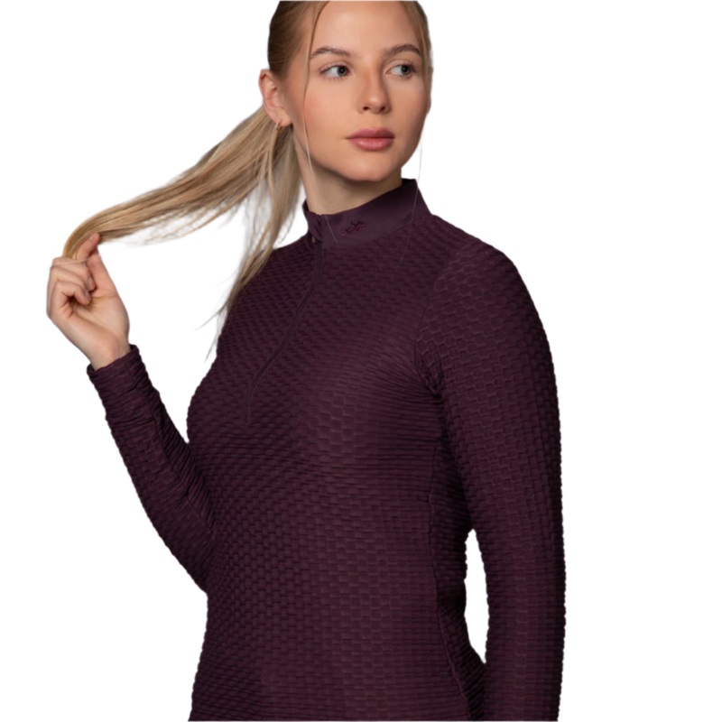 Our structured ladies training shirt SPHedy Style is the perfect choice for style-conscious riders. It features 1/1 sleeves and an elegant stand-up collar decorated with a horse logo rhinestone motif. This detail gives the shirt a special touch of elegance.
