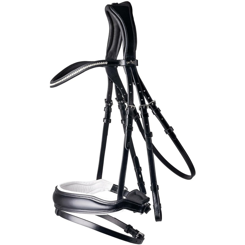 The Stanford bridle combines functionality and sporty design: The bridle with an anatomically shaped crank noseband has a unique neck piece. This was specifically adapted to the horses anatomy and allows unconfined movement of the ears. Due to the reductio