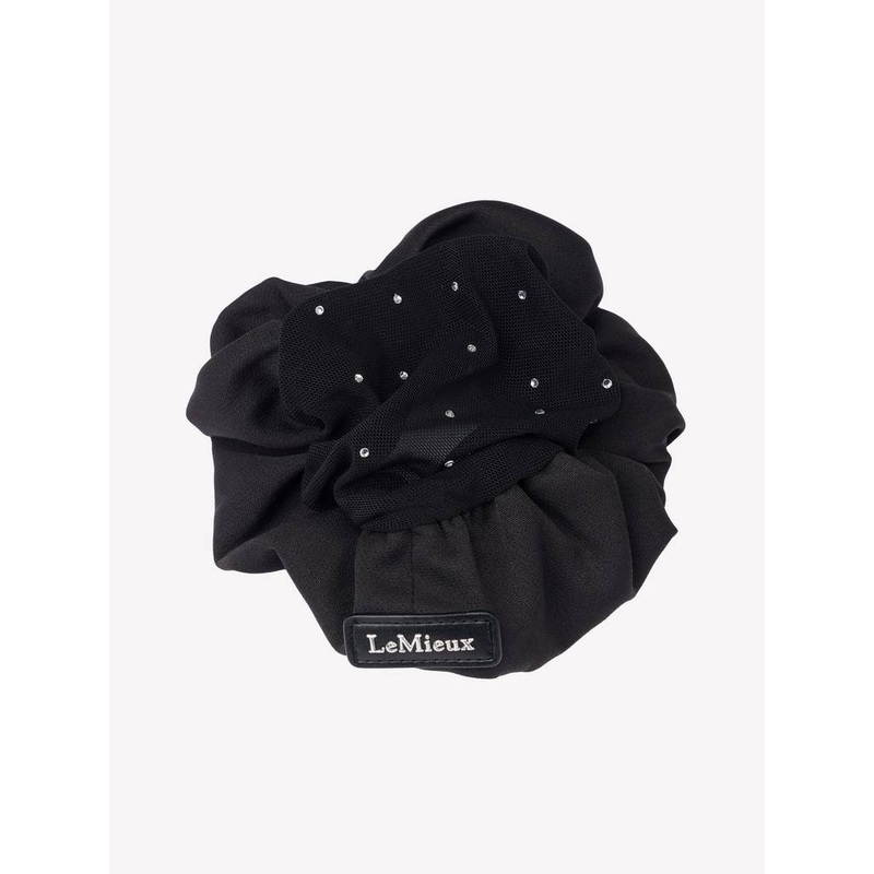 Elegant satin hair scrunchie with a LeMieux logo badge. A sewn-in hairnet adorned with sparkling crystals keeps your hair tidy while you ride, ideal for shows and events. Two hidden claw clips firmly attach to your hair.
