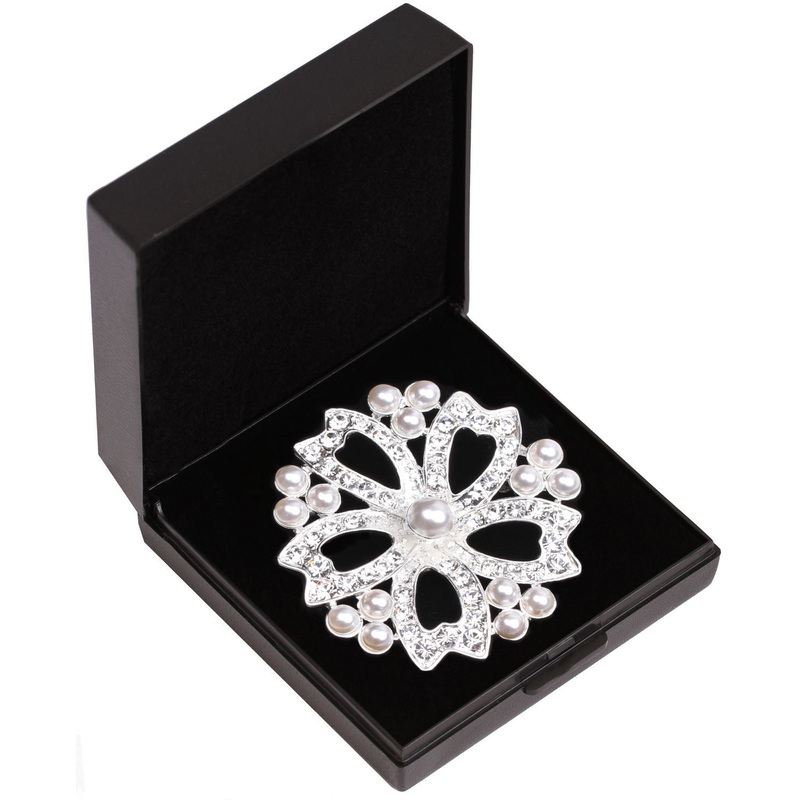 Classic stock pin with clear swarovski crystals in aflower pattern, surrounded by beautiful pearls.The pin measures 40mm in diameter.