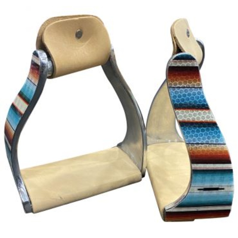ShowmanLightweight twisted angled aluminum stirrups with serape print overlay.Overlay print features a sky blue background with sunflowers and cactus'. Bottom of stirrups are wrapped in light leather. These stirrups take the pain out of breaking in fenders