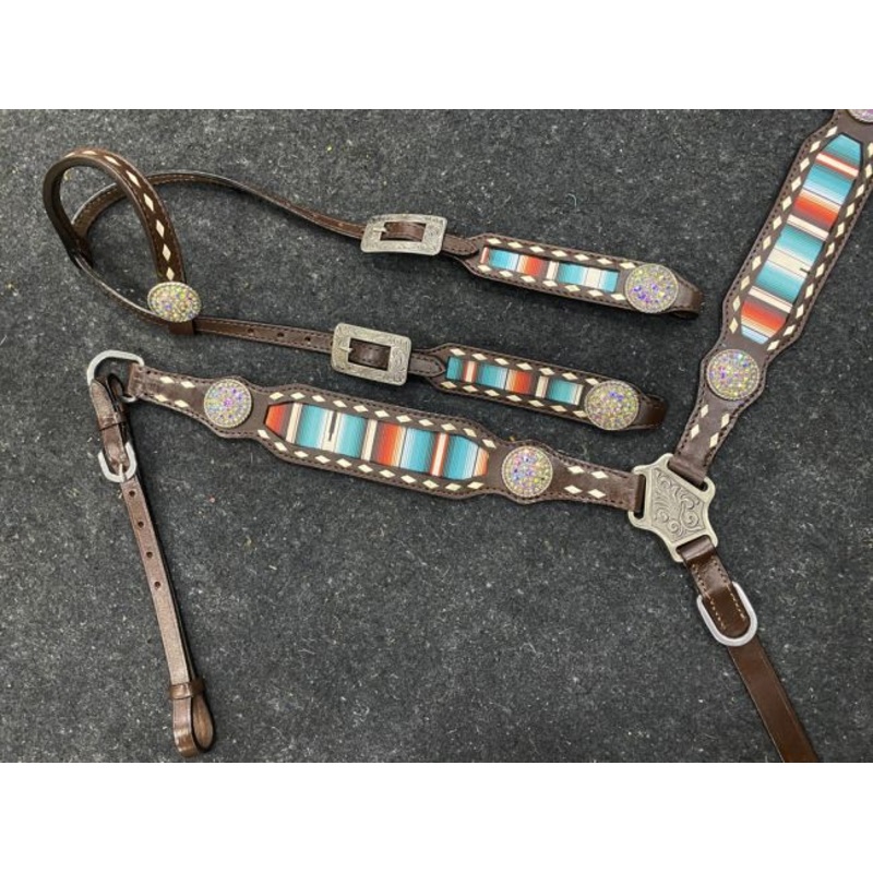 Serape Southwest Print One Ear Headstall and Breastcollar Set with bling conchos.This set features dark tooled leather with a serape southwest print overlay, silver studs, and large bling conchos. Set includes one ear headstall, breast collar, and Set come