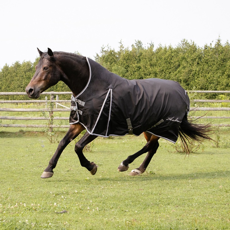 The perfect rainsheet for spring or fall, the breathable 840D ballistic nylon outer shell is tough yet lightweight, while the deluxe nylon anti-sweat lining wicks away sweat and moisture. The 200 g kersey lining is comparable to approx. 100 g of traditional polyfill, keeping your horse cozy during transitioning weather. No back seam construction coupled with taped and sealed side seams further reduces the chance of water leakage. Comfort neck design extends further up the neck and offers more coverage from the elements. Complete with crossed biased surcingles, stretchy back leg straps, doubled nylon front straps with tuck away tabs, top quality hardware, contrast piping and reinforced stitching at the stress points.