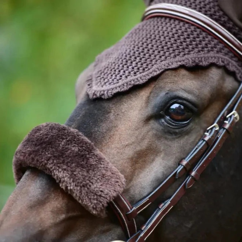 The Sheepskin Noseband Cover protects the nose of the horse against rubbing or chafing. It can also be used to protect the area behind the ears from pressure marks. Its extremely soft, comfortable and easy to put on and off thanks to the Velcro fastening. Its ideal for horses with sensitive skin plus it gives your horse a fancy look. The leather is protected against sweat and dirt. The Sheepskin Noseband Cover can also come in handy when you have a spooky horse. They can see the ground a little less so when you want to take a water jump its harder for them to see the water. The Sheepskin Noseband Cover can be washed in the machine at 30, no dryer.