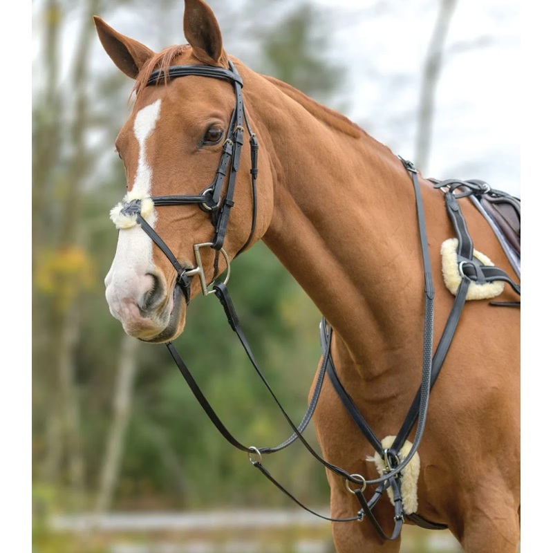 Padded with elastic inserts, removable sheepskin pads, and detachable running martingale attachment