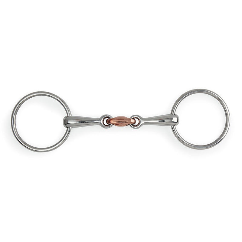 Enhance your horse’s comfort and responsiveness with the Shires Loose Ring Copper Lozenge Snaffle Bit. Designed with both horse and rider in mind, this bit features loose rings that discourage leaning, promoting a light and responsive connection. The copper lozenge softens the contact and encourages mouthing, creating warmth and stimulating salivation to keep your horse’s mouth soft and supple. Crafted from durable stainless steel, this bit is easy to clean, tasteless, and resistant to rust, ensuring long-lasting performance. Ideal for riders who want a gentle yet effective bit, the Shires Loose Ring Copper Lozenge Snaffle Bit is the perfect choice for promoting communication and comfort during your rides.