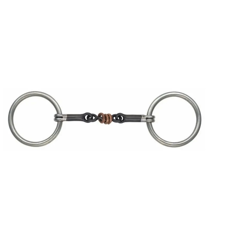 With a sweet iron mouthpiece designed to produce a sweet taste and encourage salivation as it oxidizes. The addition of copper ribs help to prevent the horse from taking to much contact, a good deterent for horses that tend to take hold. The double jointed
