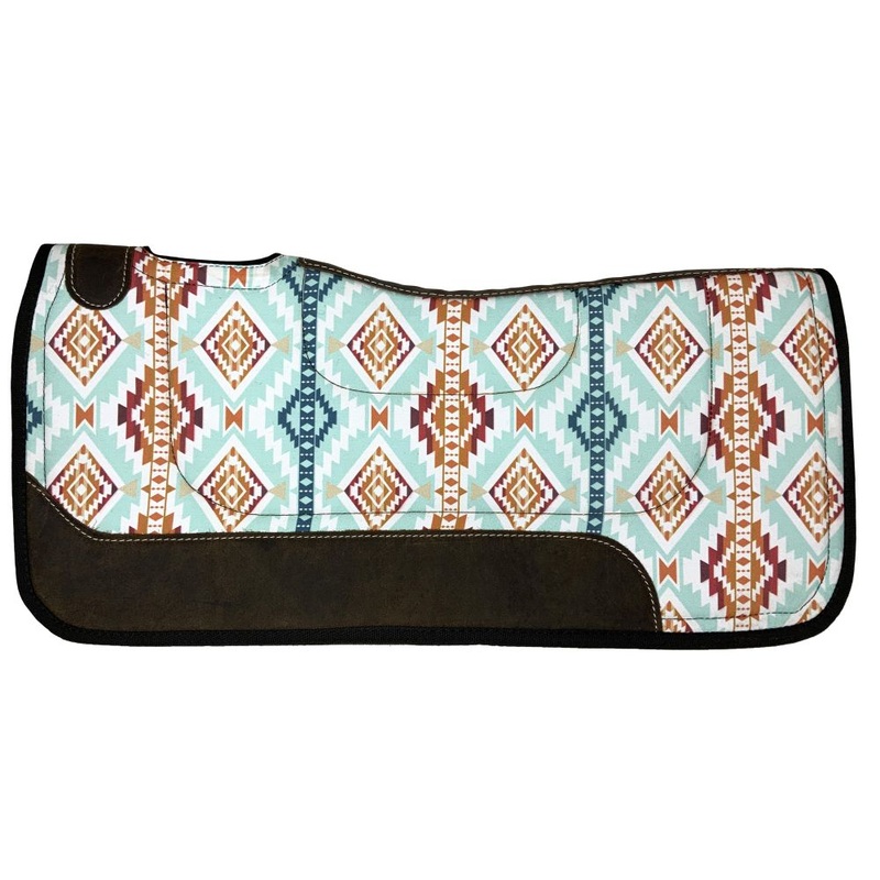This contoured shape pad is an ideal pairing for your favorite saddle. The printed top features a aqua, white, and orange pattern that is sure to grab everyone’s attention! The 34 felt base provides superior wicking properties along with excellent shock absorption to ensure you and your horse stay comfortable during the ride.This 7-pound heavy duty pad is crafted to keep up with you on the trail, or in the arena. The pad comes complete with top grain wear leathers on the sides, and spine which provide additional protection to the pad’s edges and increase its durability. The contoured design ensures a perfect fit for your horse, reducing the risk of any discomfort or injury. Any saddle is sure to look sharp on top of this fun and bold saddle pad!31 x 32Printed nylon top20mm brown felt bottomContoured fitLeather reinforced spineTop grain wear leathersVented witherGreat for everyday ridingConforms to your horses back for a sure fitSmoother shock absorbing rides.7lbsvar TabbedPanels1=new Spry.Widget.TabbedPanels(TabbedPanels1);