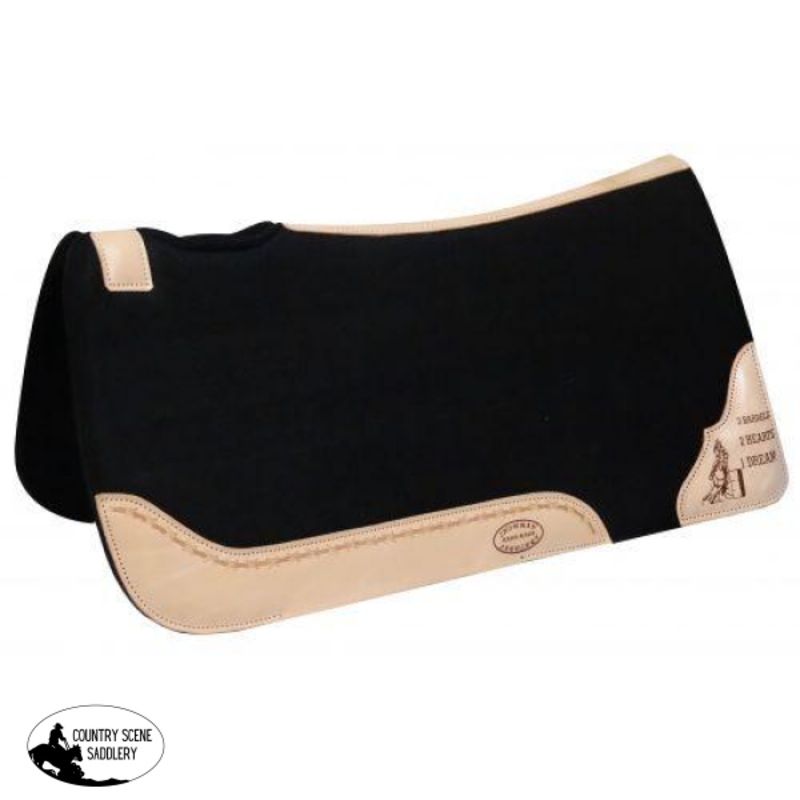 Showman 32″ x 31″ Black felt pad withbranded 3 barrels, 2 hearts, 1 dreamArgentina cow leather trim. This pad features 1″ thick black felt with a light color Argentina cow leather trim, reinforced back spine and vented wither. Corner leather features a branded 3 Barrels, 2 Hearts, 1 Dream design.