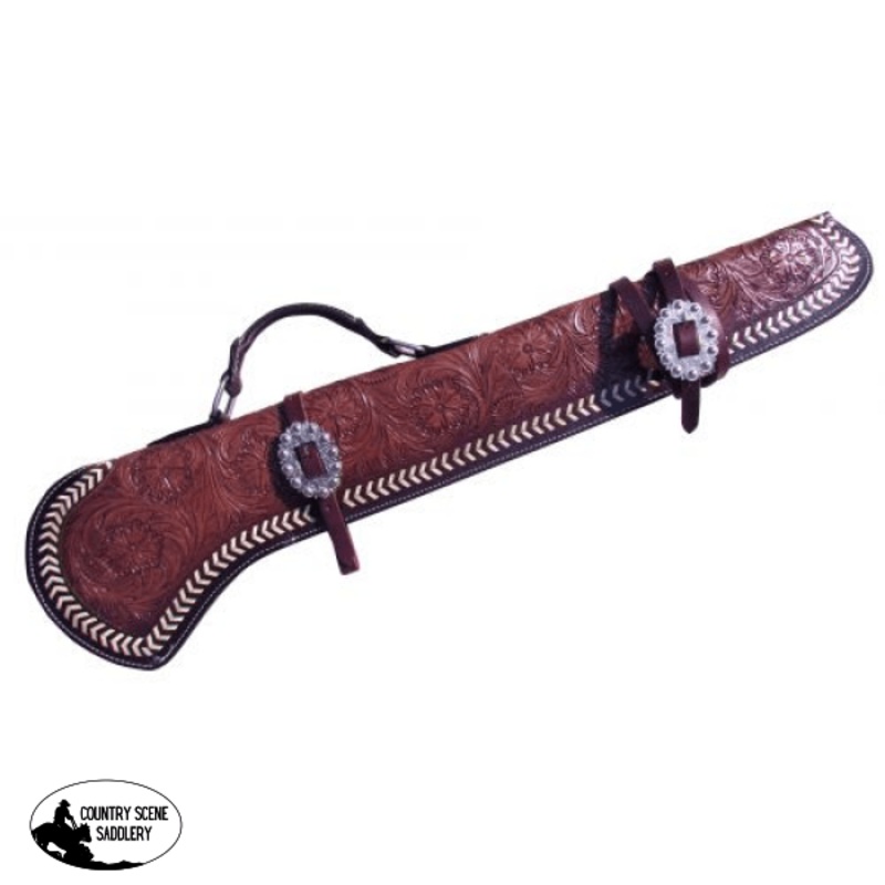 Showman34″ Floral tooled gun scabbard with engraved silver buckles.This gun scabbard features floral medium leather accented with a natural rawhide laced border and features a rolled leather handle for easy carry. Measures 34″ long