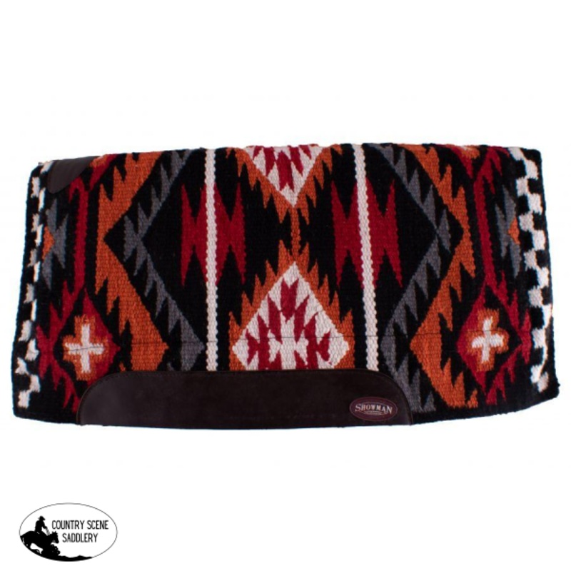 Showman 36″ x 34″ 100% woven wool top pad with memory felt bottom. This Black pad features a 1″ thick memory felt bottom with a Navajo wool top in orange and red and top grain wear leathers.