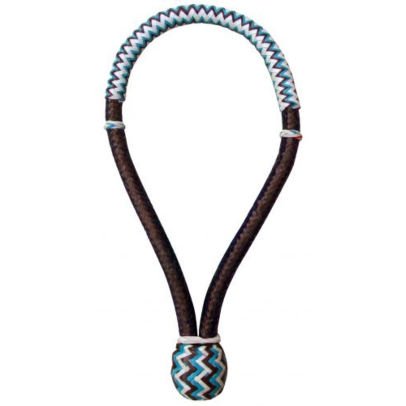 Features teal, brown and white chevron designed rawhide noseband with a brown base. Two pressure point knots placed on both sides on the nose. Bosal measures 12″ Long and 7″ wide from inside of the nose band to heel knot.