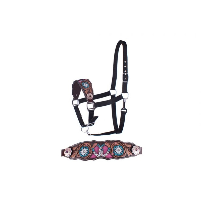 SF202309Showman Adjustable nylon bronc halter with hand painted horse shoes and floral nose band. This halter features a leather bronc style nose band with a hand painted floral and horseshoe print. Nose band is accented with pink crystal rhinestone Concho