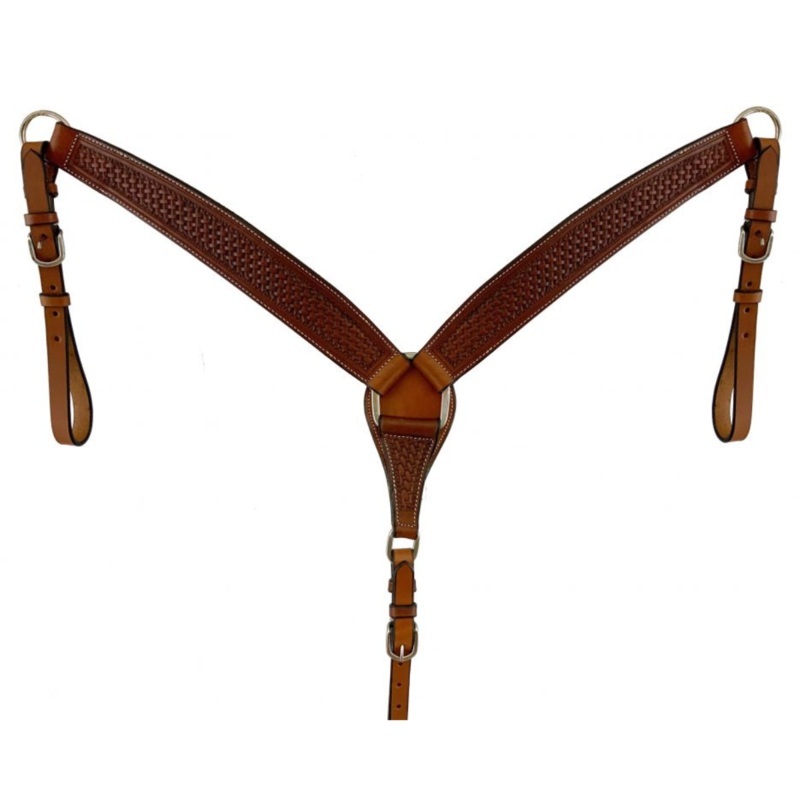 This breast collar features a medium oil basket tooled leather with 3/4" leather tugs.Hardware is Stainless Steel.