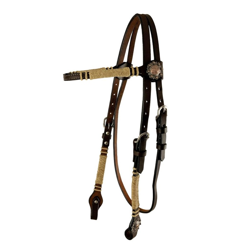 Showman Argentina Cow Leather Browband Headstall w/ Rawhide Accents. This Dark Oil Browband Argentina Cow Leather Headstall features natural rawhide braiding and copper concho accents.