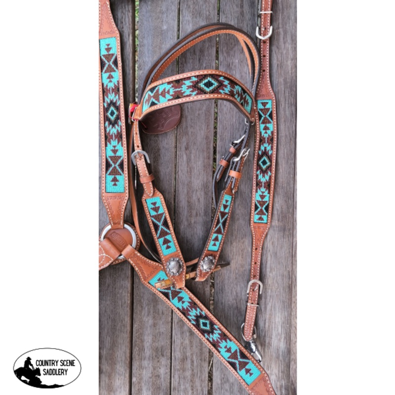 14031ShowmanArgentina Cow LeatherHeadstall and breast collar set with aztec beaded inlay. This set features medium oil leather turquoise, brown, and burgundy navajo beaded inlay. Leather is accented with minimal tooling and has brushed nickle conchos on he
