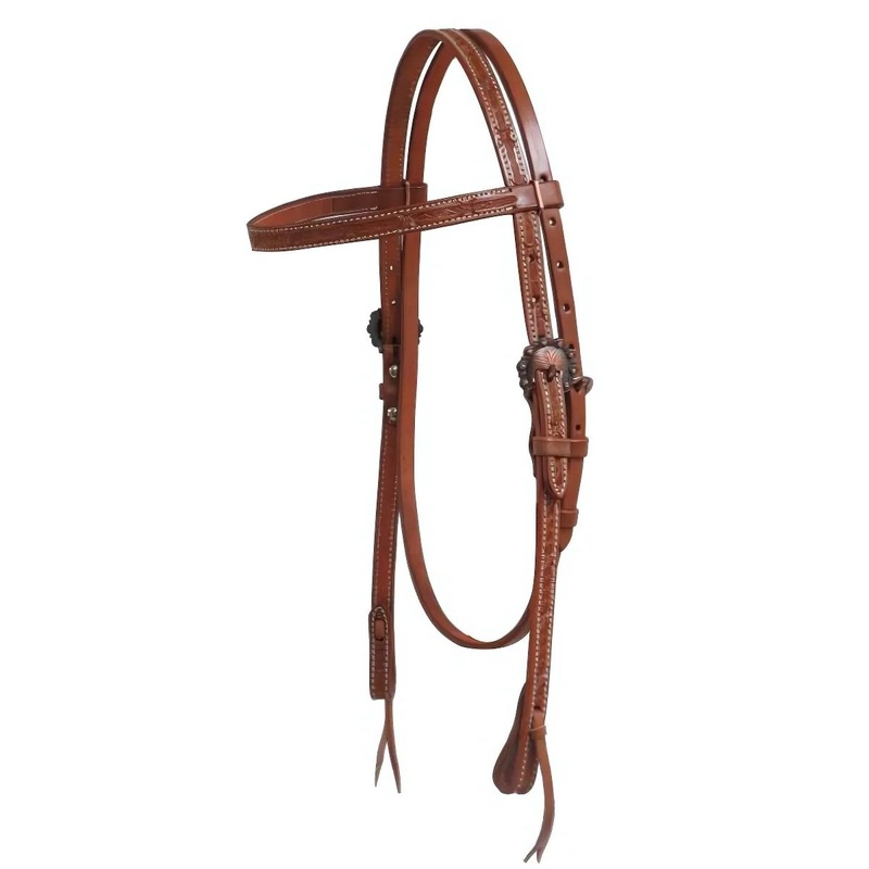 This headstall features double stitched Argentina cow leather with a tooled barbed wire design and engraved copper hardware.