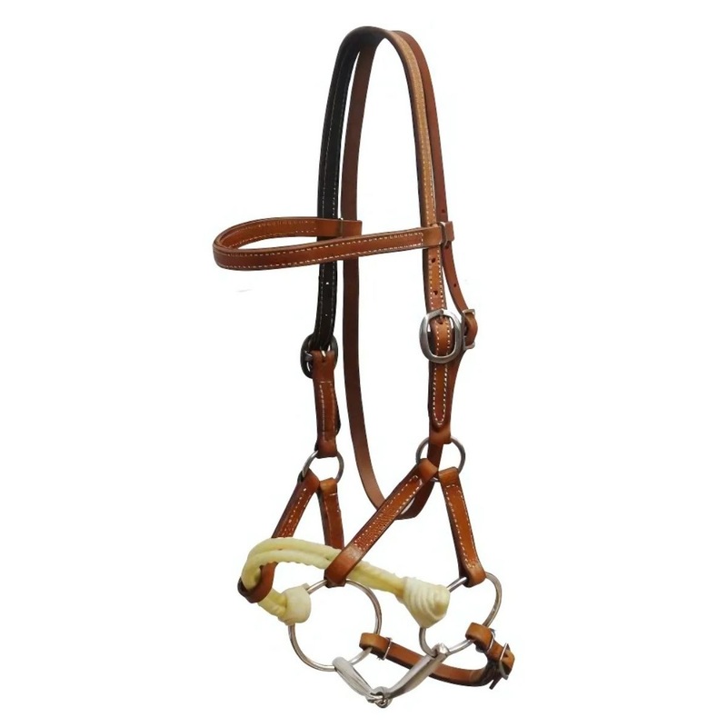 This side pull features soft, Argentina cow leather with a twisted rope nose band attached to a 5.5" O ring snaffle bit.