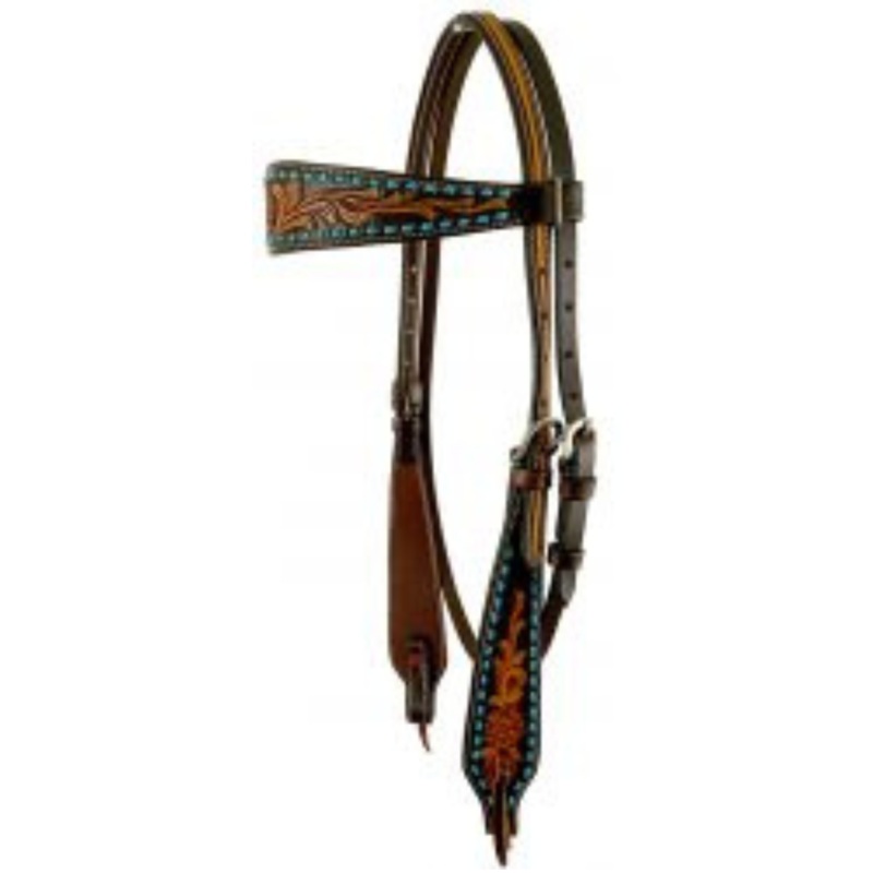 This headstall features dark and light two tone colored Argentina cow leather and is accented with floral tooling on the cheeks and browband with a turquoise rawhide lacing. Headstall has nickel hardware and features cowboy knot ties for quick change of the bit. REINS NOT INCLUDED.Hardware is Stainless Steel.