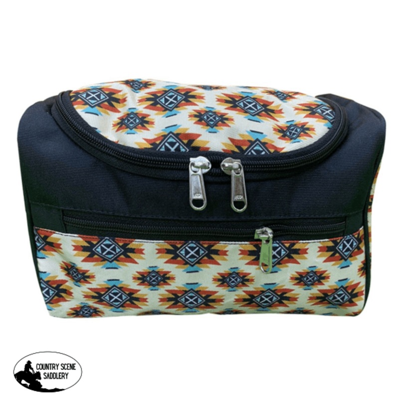 This gorgeous Aztec bag has a wide-open design with organized compartments. Compact yet spacious, this travel bag provides adequate room for all your essentials.It features a main compartment that holds larger items such as shampoo bottles, shaving cream, orlotion. A zippered mesh pouch that will keep your smaller toiletries and cosmetics in place, a front zipper pocket that provides extra storage, and 8additional mesh dividers and internal storage spaces. Built-in hook displays the kit from a shower or towel rack to allow for fast access to your items, and tucks away when not in use. Designed for anyone and is an extremely versatile travel bag that can be used as a toiletry bag, makeup or shaving kit, or even to store healthcare items on the go. Lightweight, easy to clean, and perfect for the road trip to your next show or rodeo!