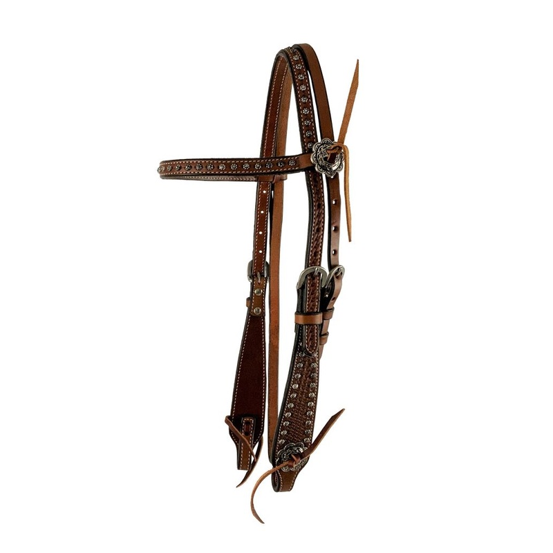 This classic headstall features medium oil colored Argentina cow leather and is accented with basket stamp tooling on the cheeks and browband with a silver beading and antique silver conchos. Headstall has nickel hardware and features cowboy knot ties for