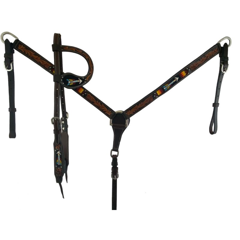 Showman Beaded Arrow design 4 Piece Argentina Leather Headstall and Breastcollar Set with Matching Whither Strap & Spur Straps. This set features Dark Argentina Cow leather with a beaded arrow design in black, yellow, and red beads. Set is accented with silver beads and buckles and a floral lighter tooling. Set comes with single ear headstall, breastcollar, wither strap, and spur straps. Hardware is Stainless Steel.FINAL CLEARANCEThis is a CloseoutDiscontinued item. Sizes, colors and quantities are limited.No refundsNo exchanges on CloseoutDiscontinued items. Products are sold as is.var TabbedPanels1=new Spry.Widget.TabbedPanels(TabbedPanels1);