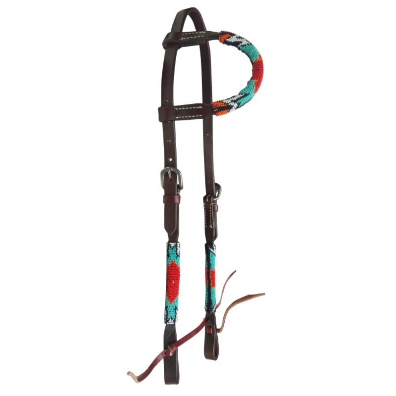 Showman Beaded one ear Argentina Cow Leather headstall with southwest design – red, teal, and orange