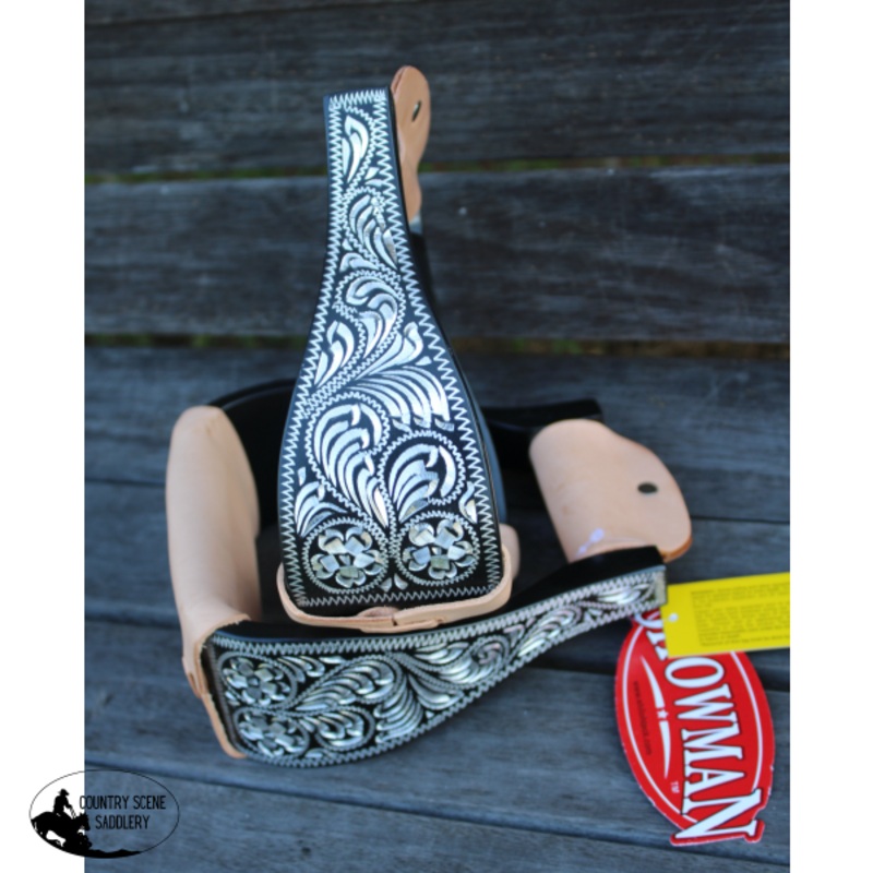 175869ShowmanBlack Alluminum Engraved Stirrups. These stirrups feature 5" boot width with 2.25" tread and a 3" neck. Black alluminum with floral engravings with light color leather tread.Pre Orders