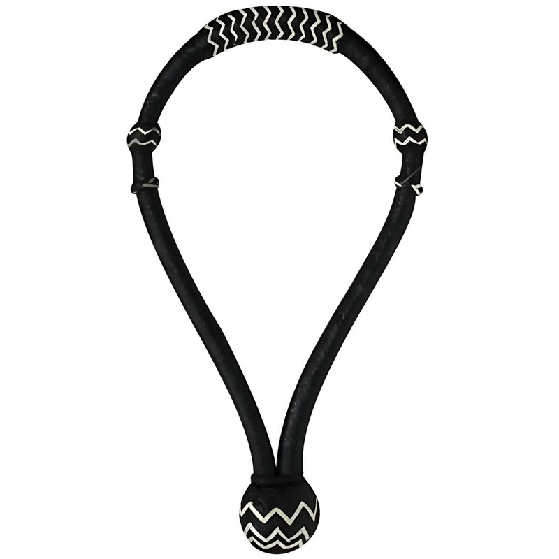 This bosal features black braided rawhide with white rawhide design with a rawhide core. Quality braided rawhide perfect for training or showing. Two pressure point knots placed on both sides on the nose. Bosal measures 11" Long and 6.5" wide from inside o