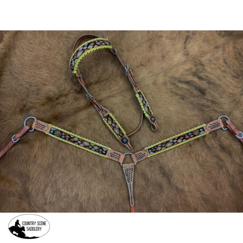 Showman Browband beaded Browband Headstall and Breast collar Set w/ yellow laced edge accents. This set features a medium colored leather with Aztec beaded inlay and a yellow laced outline. Set comes complete with 5/8″ x 7′ split leather reins.