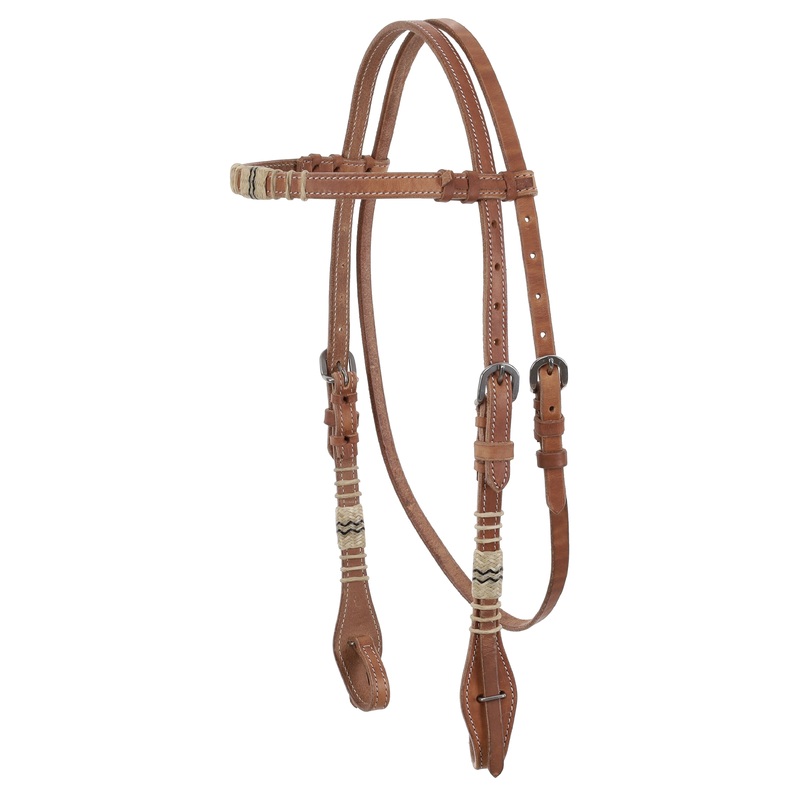 Showman Browband Harness Leather headstall with quick change bit loops and rawhide accents. This headstall features harness leather with stainless steel hardware and quick change bit loops with a natural rawhide braiding on the browband and cheeks with a black accent. REINS NOT INCLUDED.Hardware is Stainless Steel.var TabbedPanels1=new Spry.Widget.TabbedPanels(TabbedPanels1);