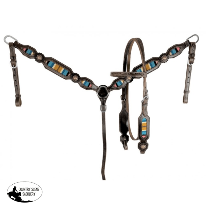 ShowmanBrowband Headstall & Breast collar set with wool southwest blanket inlay.This set features a medium leather with a vibrant color serape design wool blanket inlay on headstall and Breast collar. Set comes complete with matching headstall, breast collar, and 5/8″ x 7′ leather split reins.