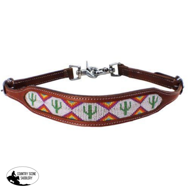 Showman cactus and triangle beaded design wither strap. This wither strap features medium leather with a cactus and triangle beaded design. Beads are lime green, pink, orange, yellow, and light blue in color. Includes stainless steel hardware.