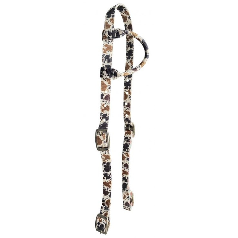 Showman Cowhide Print Nylon One Ear Headstall. This headstall is made of soft and durable premium 2 ply nylon material. Easily adjusts on both cheeks with nickel plated buckles and easy change bit loops. Will adjust approx. 15 to 19 (crown to cheek).var TabbedPanels1=new Spry.Widget.TabbedPanels(TabbedPanels1);