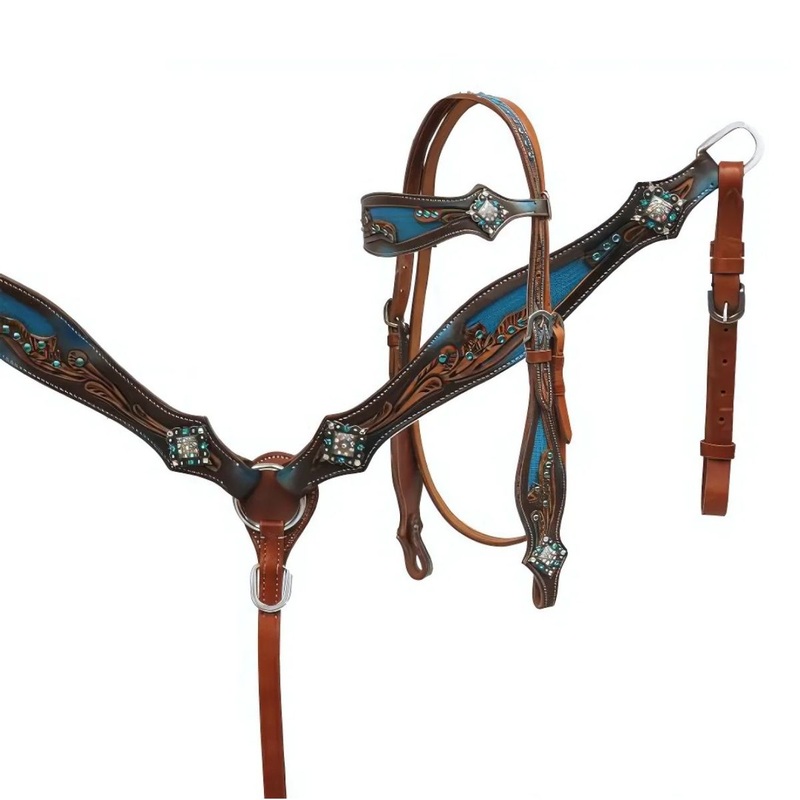 This set features medium leather with a floral tooled design and a metallic blue inlay on cheeks and browband. Leather is accented with teal crystal rhinestones and iridescent crystal rhinestone conchos. Headstall comes with 5/8" x 7' leather split reins.