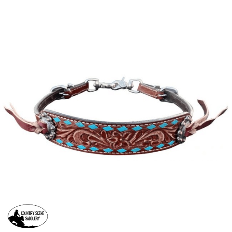 Showman Distressed Medium leather wither strap with teal rawhide lacing.This wither strap features a distressed leather with teal rawhide lacing accent and latigo tie accents. Includes stainless steel hardware.