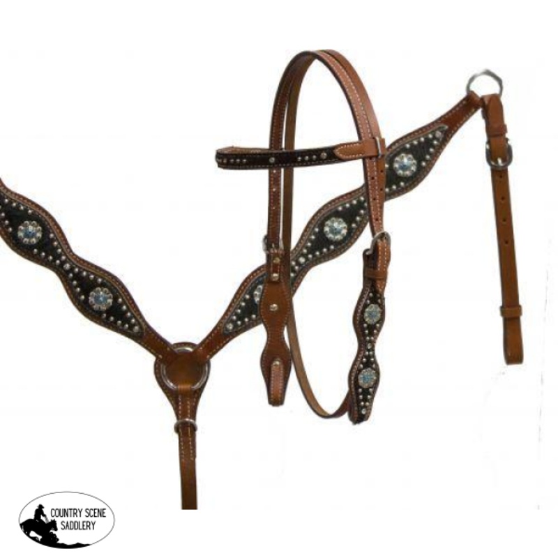 Showman double stitched leather headstall and breast collar set withhair on cowhide. Headstallfeatureshair on cowhide on cowhide browband and cheeks accented withsilver beads and crystal rhinestones. Breastcollar featureshair on cowhide with flower conchos