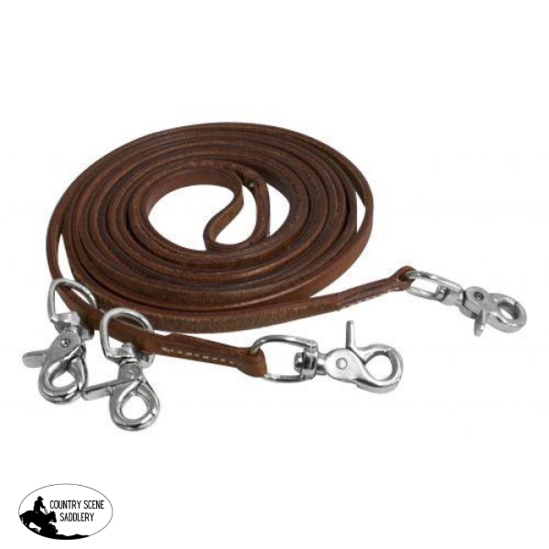 Showman Harness leather draw reins with 4 scissor snaps. 3/8″ x 11ft.