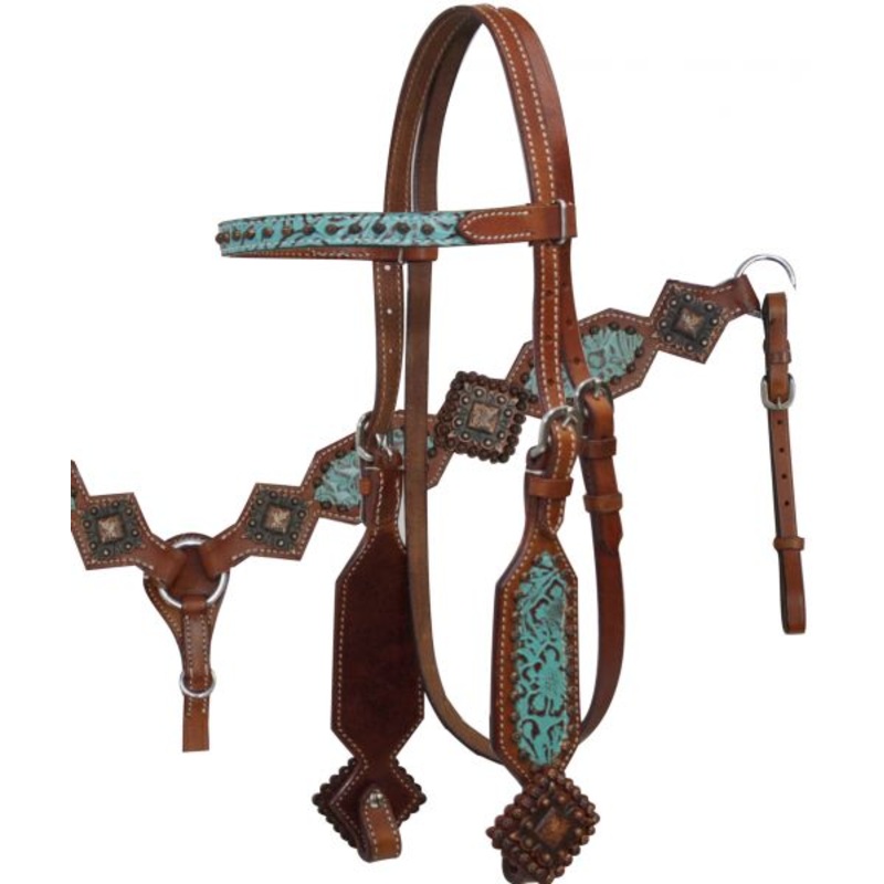 This headstall and breast collar set features diamond shaped cheeks and straps with teal and brown filigree overlay and is accented with engraved copper colored diamond conchos and silver studs. Headstall comes with 5/8" x 7' leather reins. Size: AVERAGE F