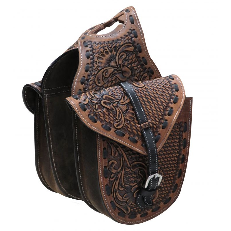 ShowmanFloral and basket weave tooled leather horn bag. This bag features a combination of basket and floral tooling accented with a black buck stitch border. Easily close with buckle closure. This horn bag comes with D rings on the bottom of each bag.var TabbedPanels1=new Spry.Widget.TabbedPanels(TabbedPanels1);