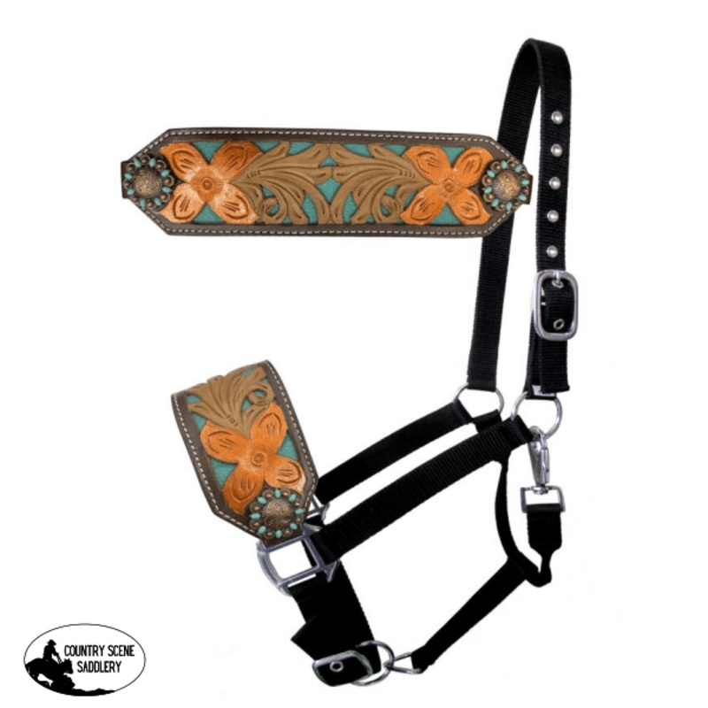 Showman Floral tooled Nylon bronc halter with teal inlay.This is a black nylon halter with meadium floral tooled accent noseband with teal inlay. Accented with turquiose accent Conchos to match.