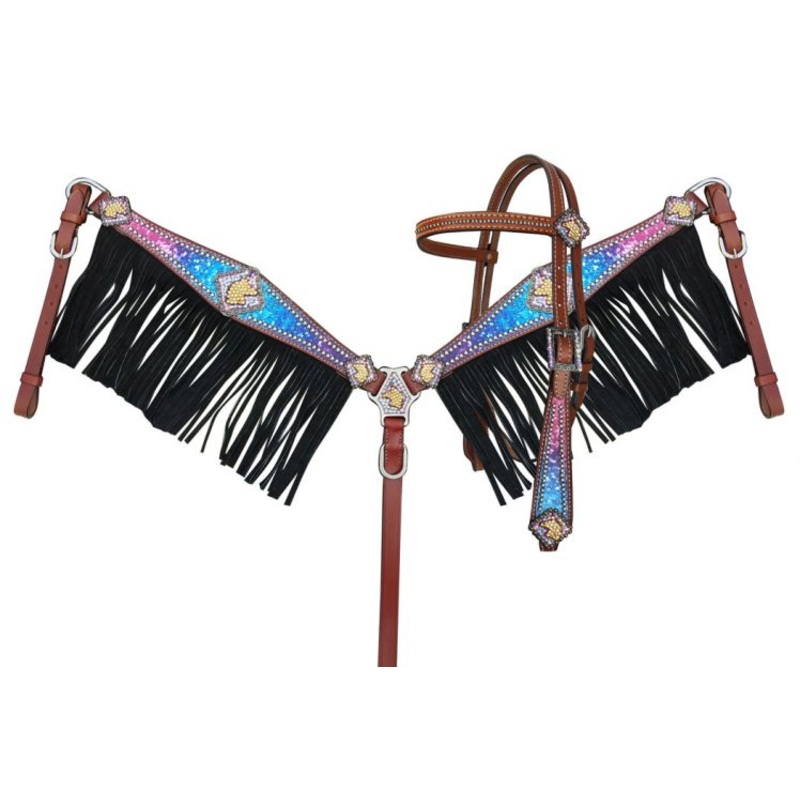 Showman Galaxy print browband headstall and breastcollar set with unicorn conchos and black suede leather fringe. This set features medium leather with a pink, purple, and teal galaxy print overlay on browband headstall and breastcollar. Breastcollar is accented with black suede leather fringe. Set is accented with square unicorn crystal rhinestone conchos and headstall comes with 58 x 7′ leather split reins.var TabbedPanels1=new Spry.Widget.TabbedPanels(TabbedPanels1);