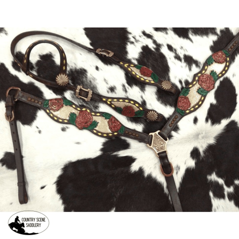 14393Showman Gold snake print inlay with painted rose accent one ear headstall and breast collar set. This set features dark leather with a gold snake print inlay. Set is accented with a painted roses and buckstitch accent and copper Conchos and studs. Hea