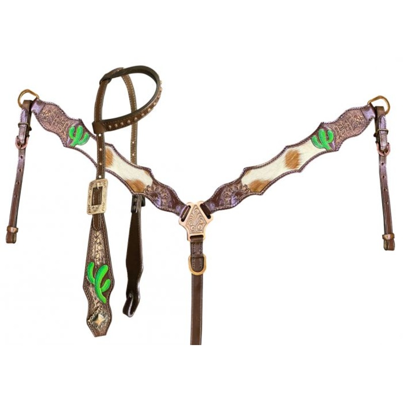 Showman Hair on Cowhide One Ear Leather Headstall and Breast Collar Set with Hand Painted Cactus**REAL COWHIDE- Patterns of cowhides canwill vary**var TabbedPanels1=new Spry.Widget.TabbedPanels(TabbedPanels1);