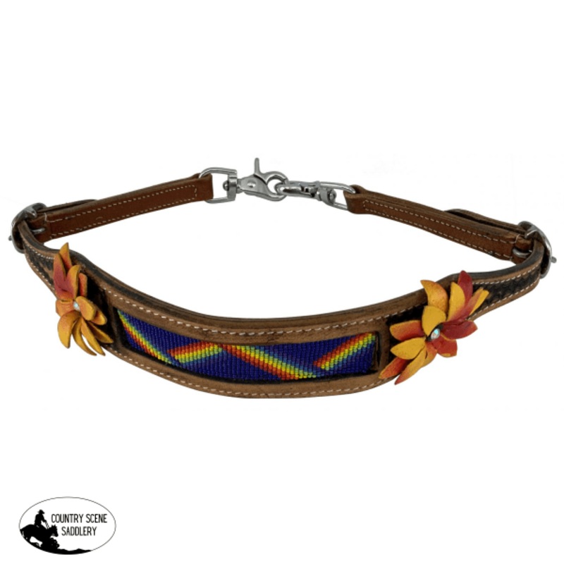 Showman Hand painted 3D flower wither strap with beaded center. This wither strap features medium leather with hand painted 3D yellow flower with bling center, and rainbow multi color beaded center . Includes stainless steel hardware.